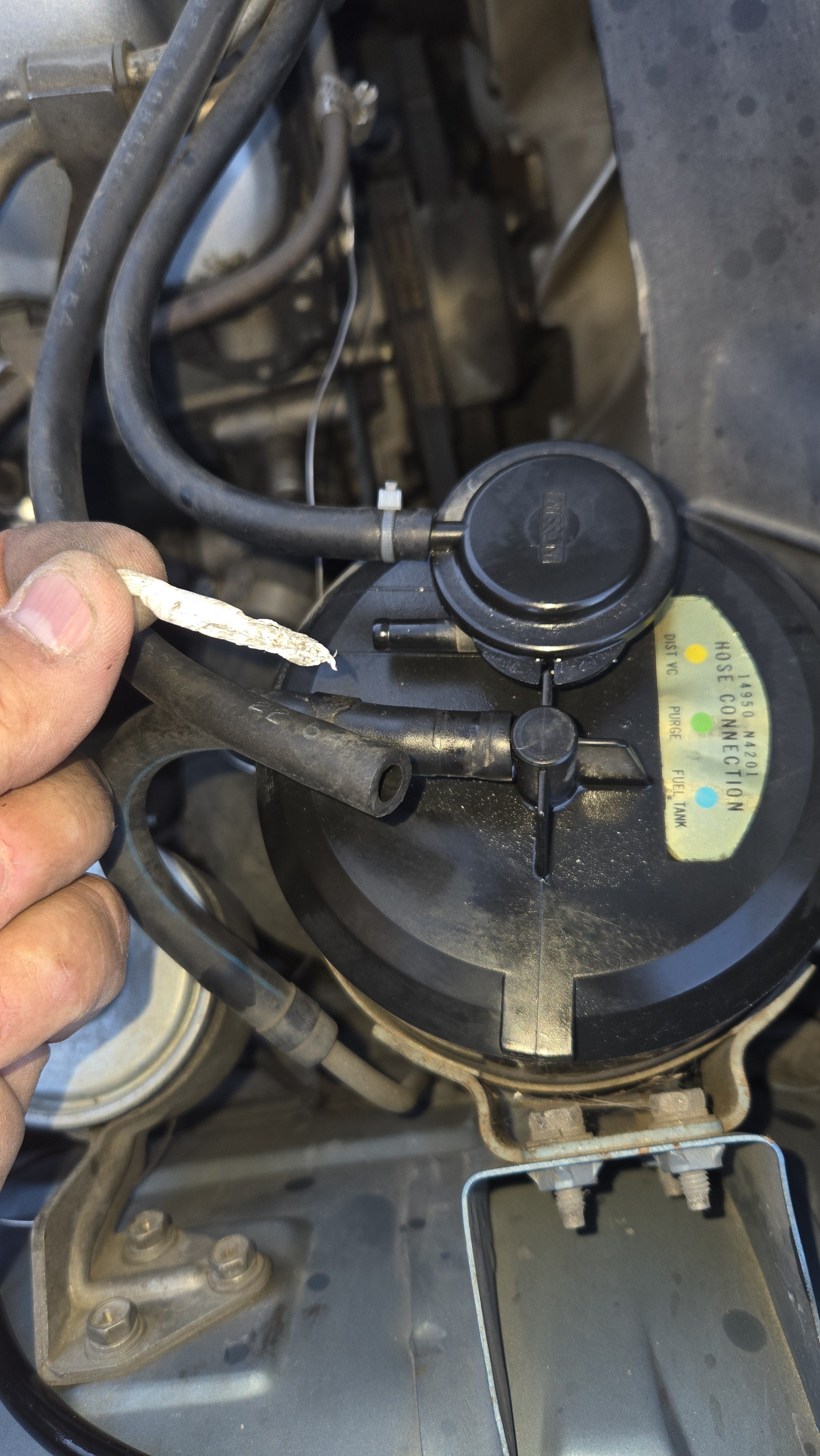 One last thing, I blew smoke through the charcoal canister hoses and one of them was clogged and this is what I pulled out of the hose, it looks like Teflon tape. Is there a reason why this was stuffed in there? I haven't driven it since I pulled it out but it starts up, idles and revs the same.